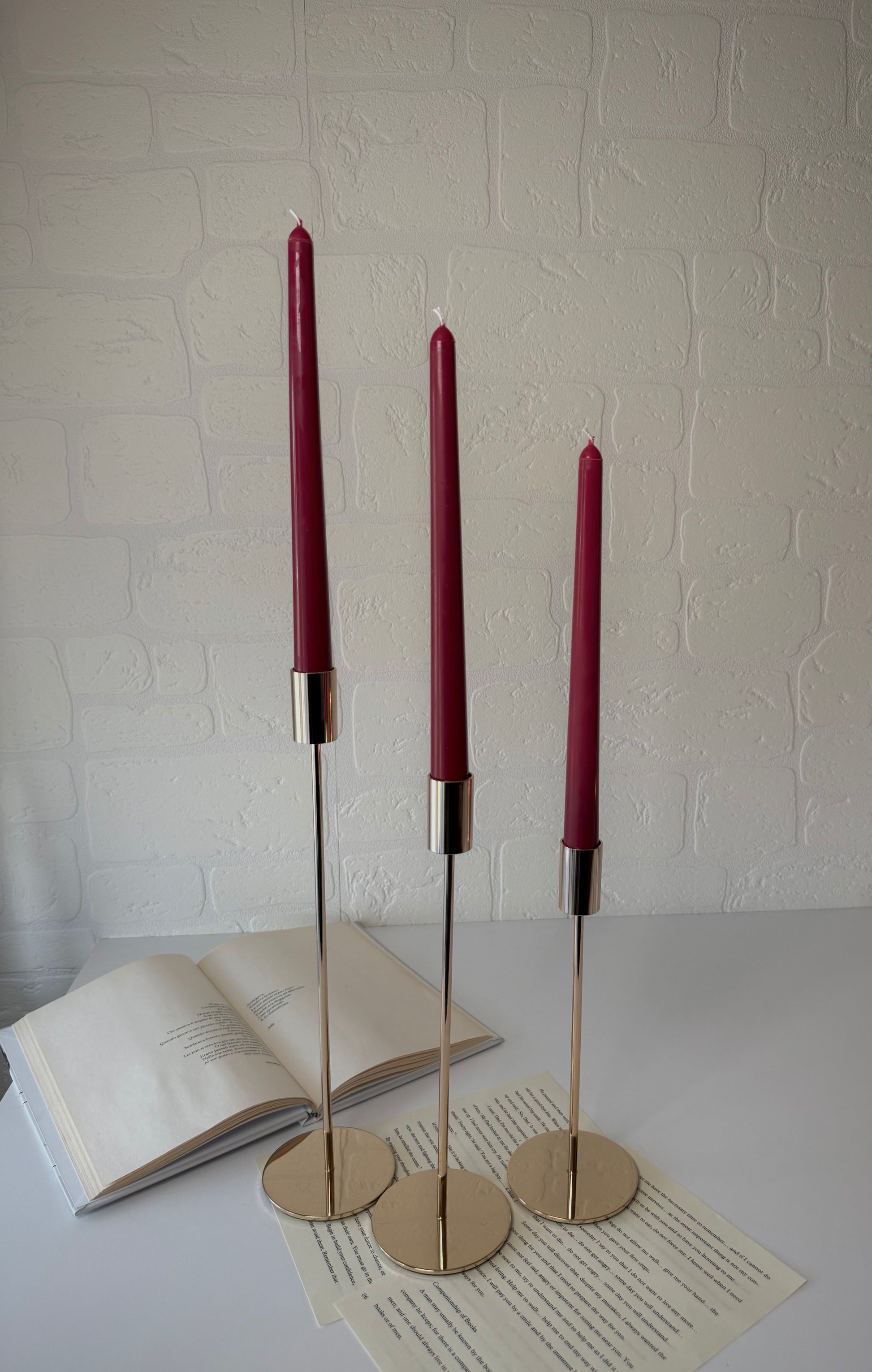 Set di tre candele lisce in pura cera d'oliva, dal colore bordeaux profondo e sofisticato. Realizzate con maestria artigianale, queste candele classiche diffondono una luce calda e uniforme, ideale per creare un'atmosfera intima durante una cena romantica. La cera d'oliva garantisce una combustione pulita e duratura, mentre il design essenziale si adatta a qualsiasi tavola. Un'opzione elegante per chi apprezza i dettagli raffinati e i materiali naturali di qualità.