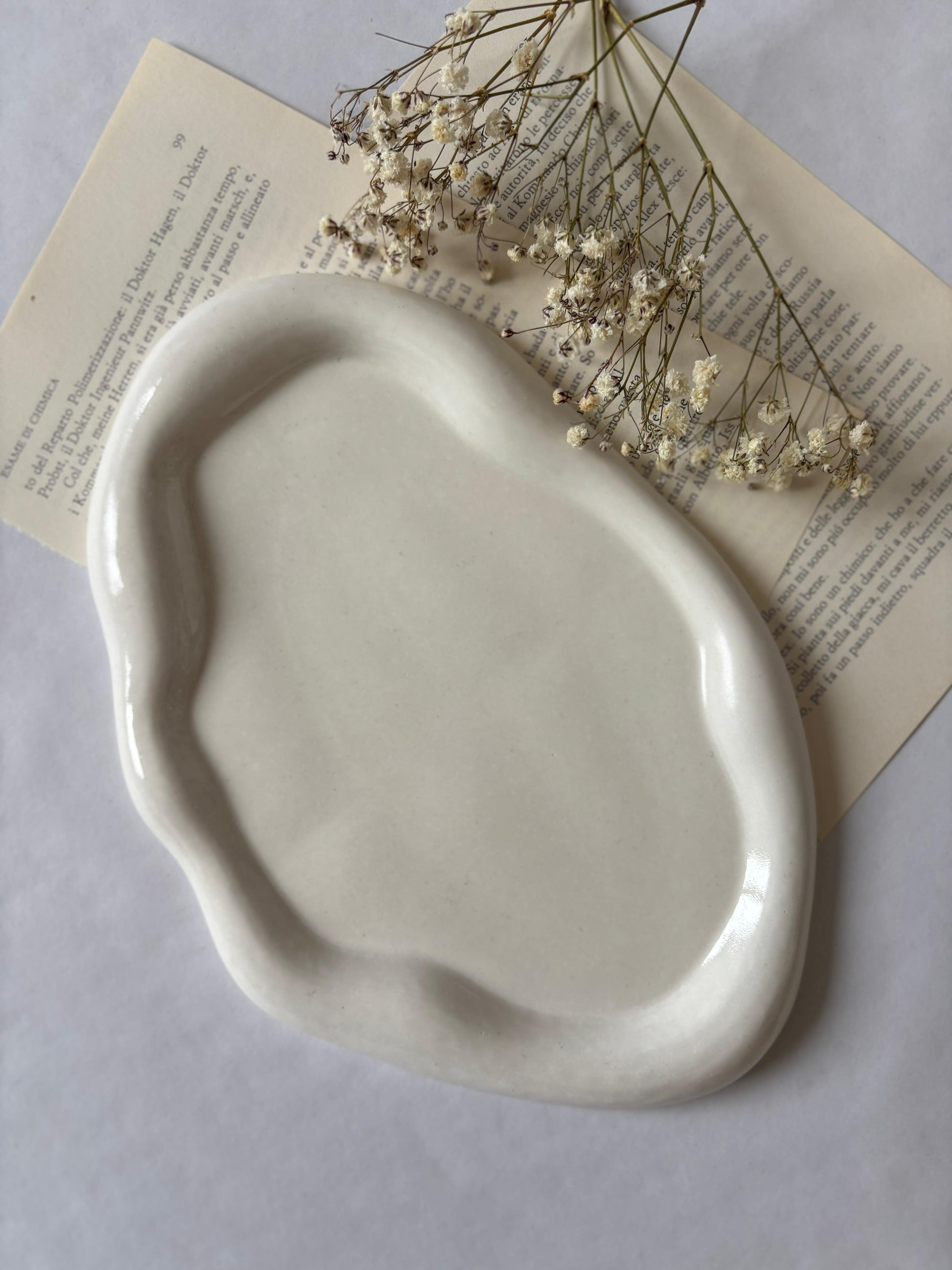 Il Vassoio Onda incarna l'eleganza della semplicità attraverso linee fluide e irregolari che evocano il movimento naturale dell'acqua. Realizzato interamente a mano in gesso ceramico, ogni pezzo rappresenta un'opera unica caratterizzata da una naturale asimmetria che lo distingue. Perfetto per riporre gioielli, piccoli oggetti o come elemento decorativo autonomo, questo complemento d'arredo si adatta con versatilità a qualsiasi ambiente, aggiungendo un tocco di raffinatezza e originalità al tuo spazio.
